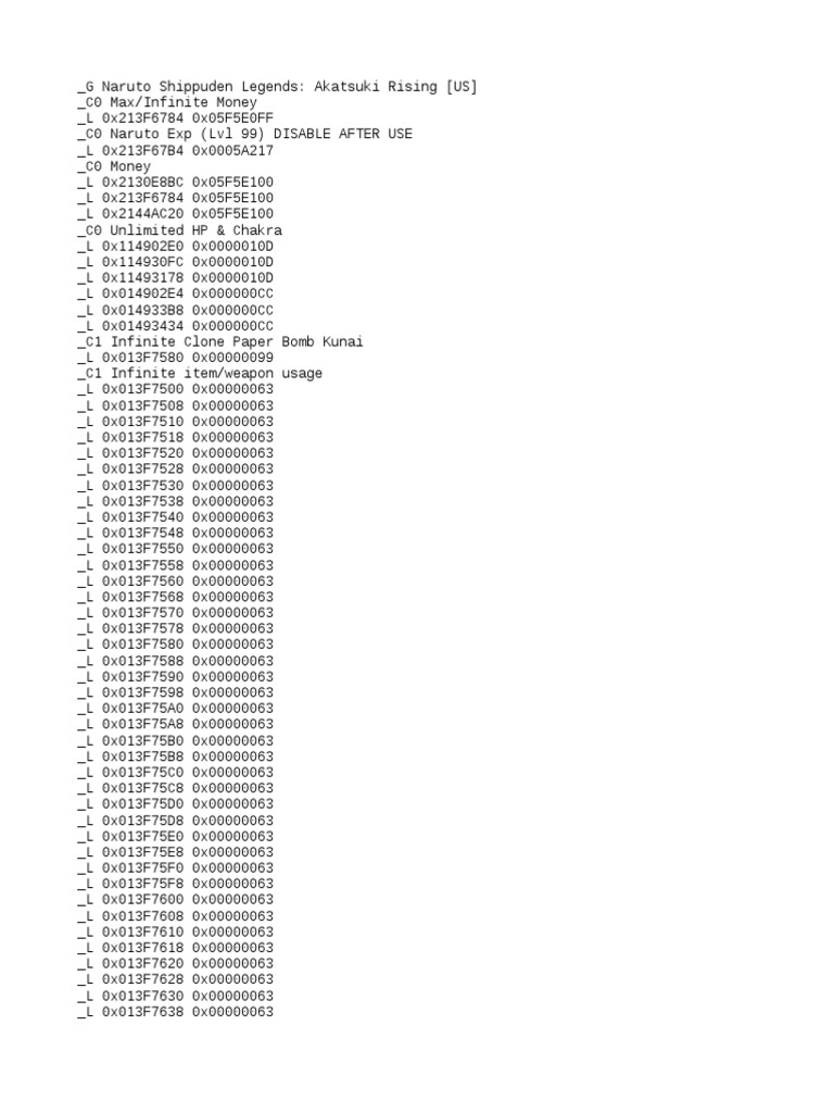 L 0x213f6784 0x00999999 c0 hp l 0x014902e0 0x000000ff c0 chakra l 0x014902e4 0x000000ff c0 infinite item weapon usage l 0x013f7500 0x00000063 l 0x013f7508 0x00000063 l 0x013f7510 0x00000063 l 0x013f7518 0x00000063 l 0x013f7520 0x00000063 l 0x013f7528 0x00000063 l. Heels inf arrows infinite item weapon jump slow. S ules 01306 g naruto shippuden. One of my biggest initial disappointments with akatsuki rising was the story.